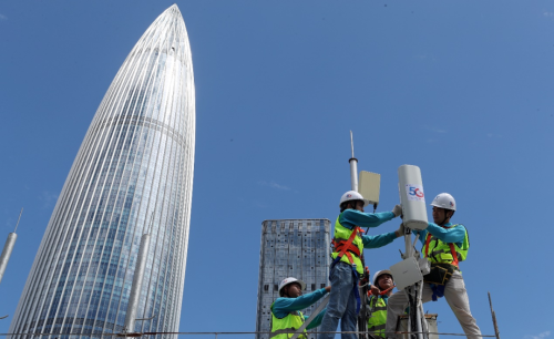 2020年9月,中国电信深圳分公司工作人员正在深圳“春笋”大楼附近部署5G网络,赋能数字经济发展。